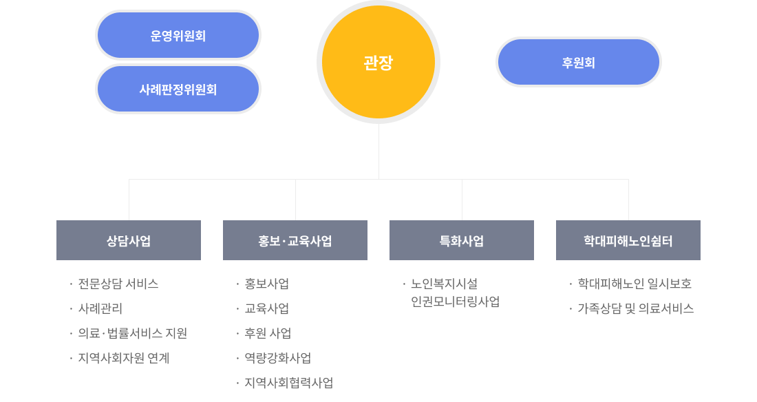 상담팀: 전문상담 서비스, 사례관리, 의료∙법률서비스지원, 지역사회자원 연계